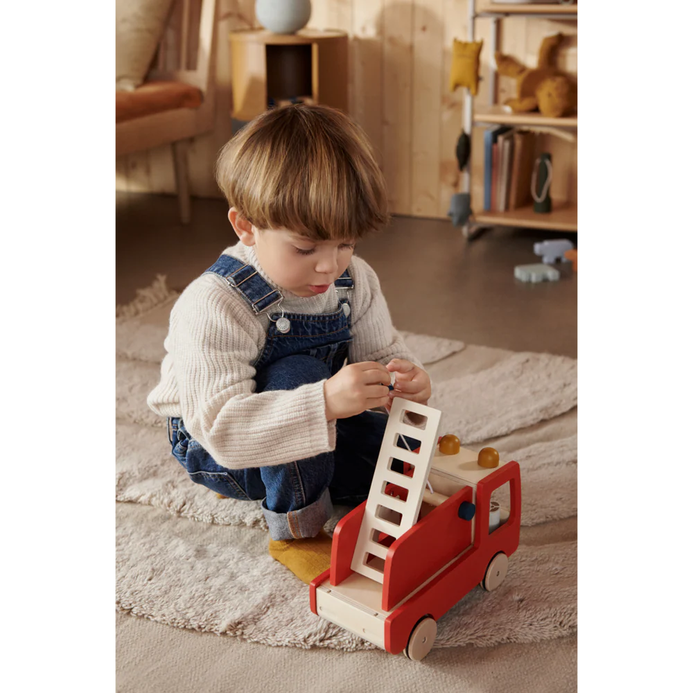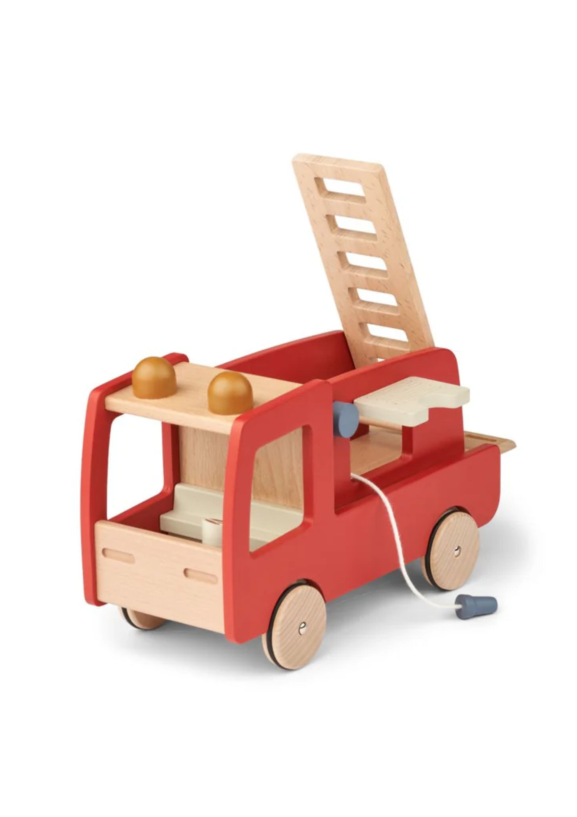 Grote houten brandweerwagen met beweegbare details die fantasierijk spel stimuleren, alleen of samen, en uitnodigen tot ontdekken.