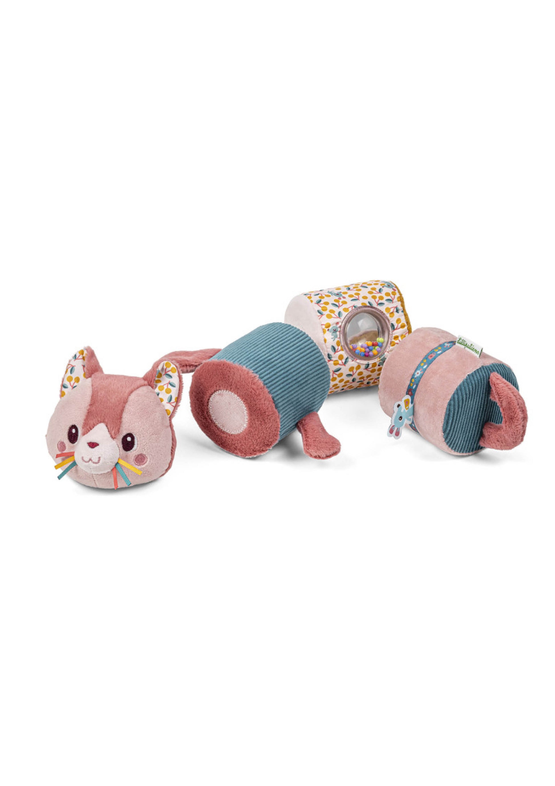 Jeanne de kat geluidsrol is een speels en veelzijdig activiteitenspeeltje voor baby’s vanaf 6 maanden, met 4 losse rolletjes vol geluid, textuur en ontdekking.