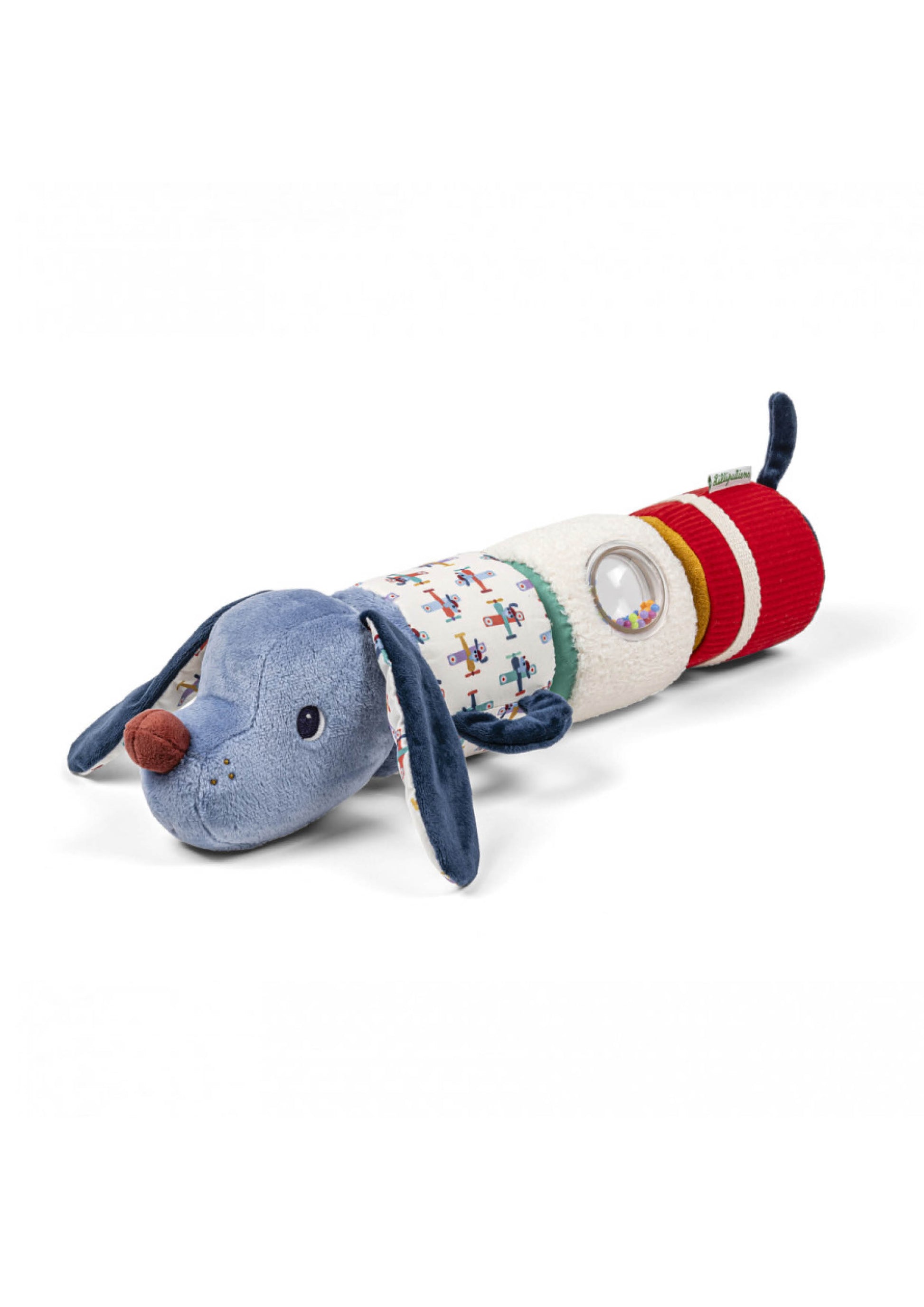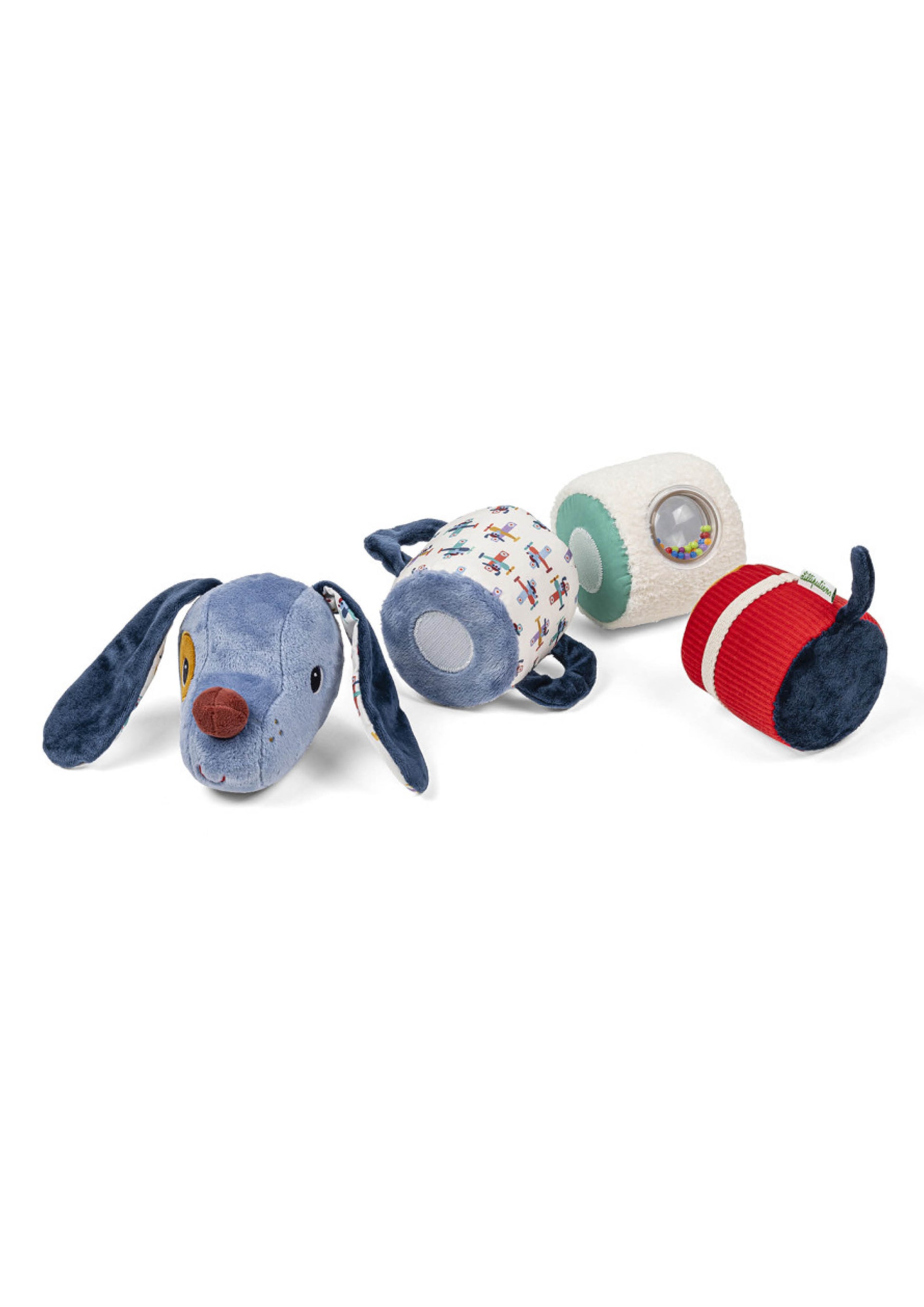Jules de hond geluidsrol is een veelzijdig activiteitenspeeltje voor baby’s vanaf 6 maanden, ontworpen om zintuigen te prikkelen en motoriek te stimuleren – met 4 losse rolletjes vol geluid en textuur.