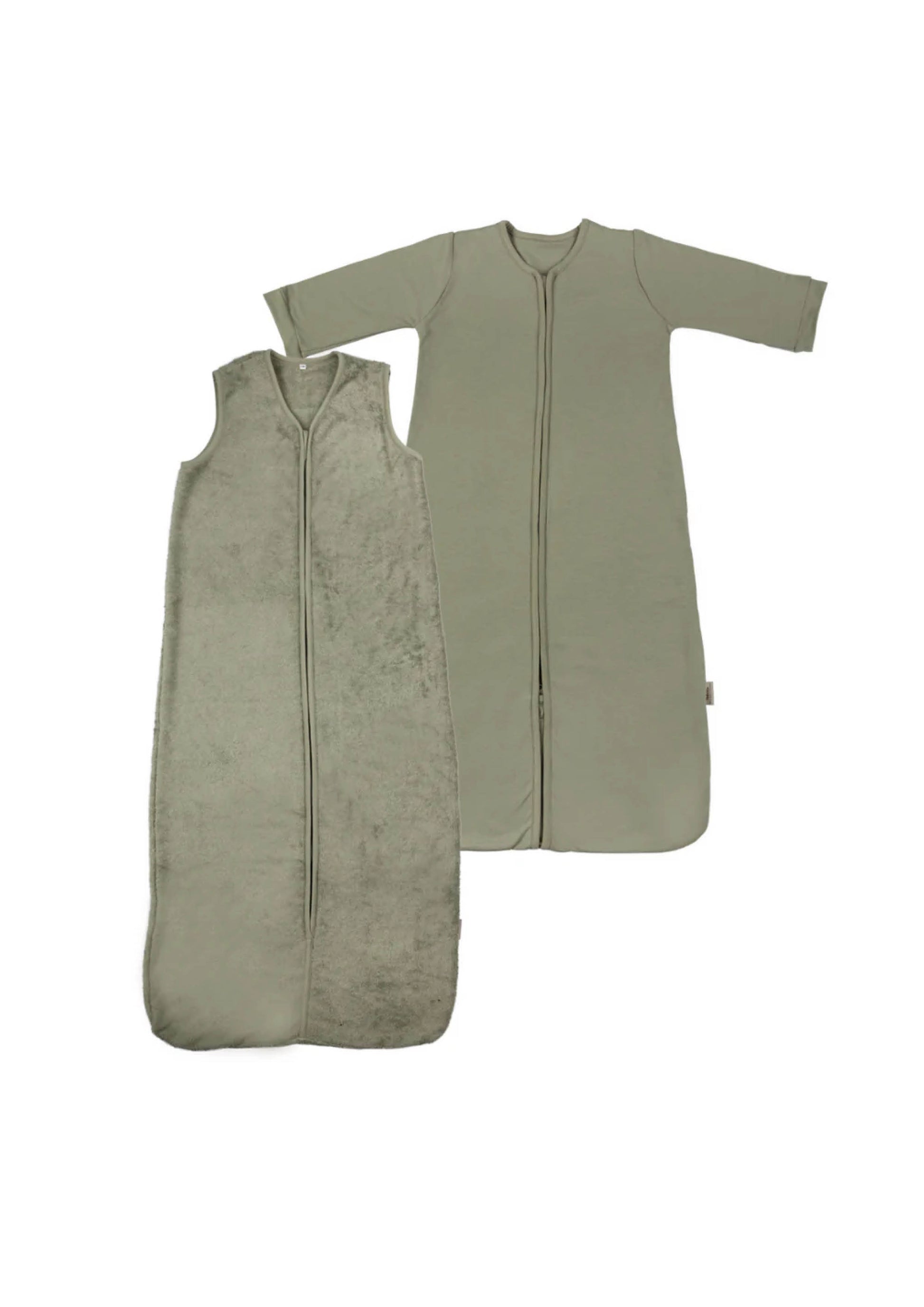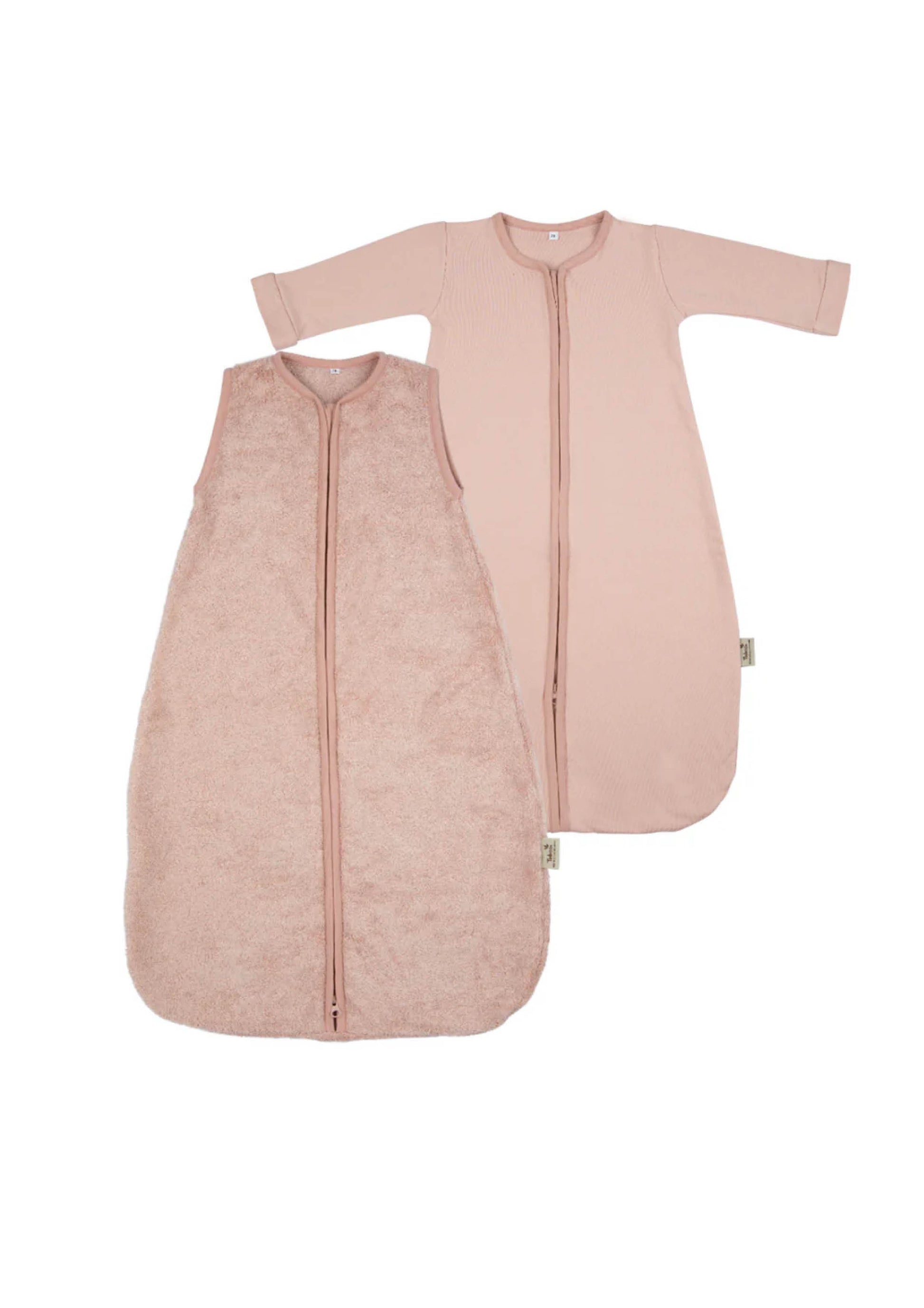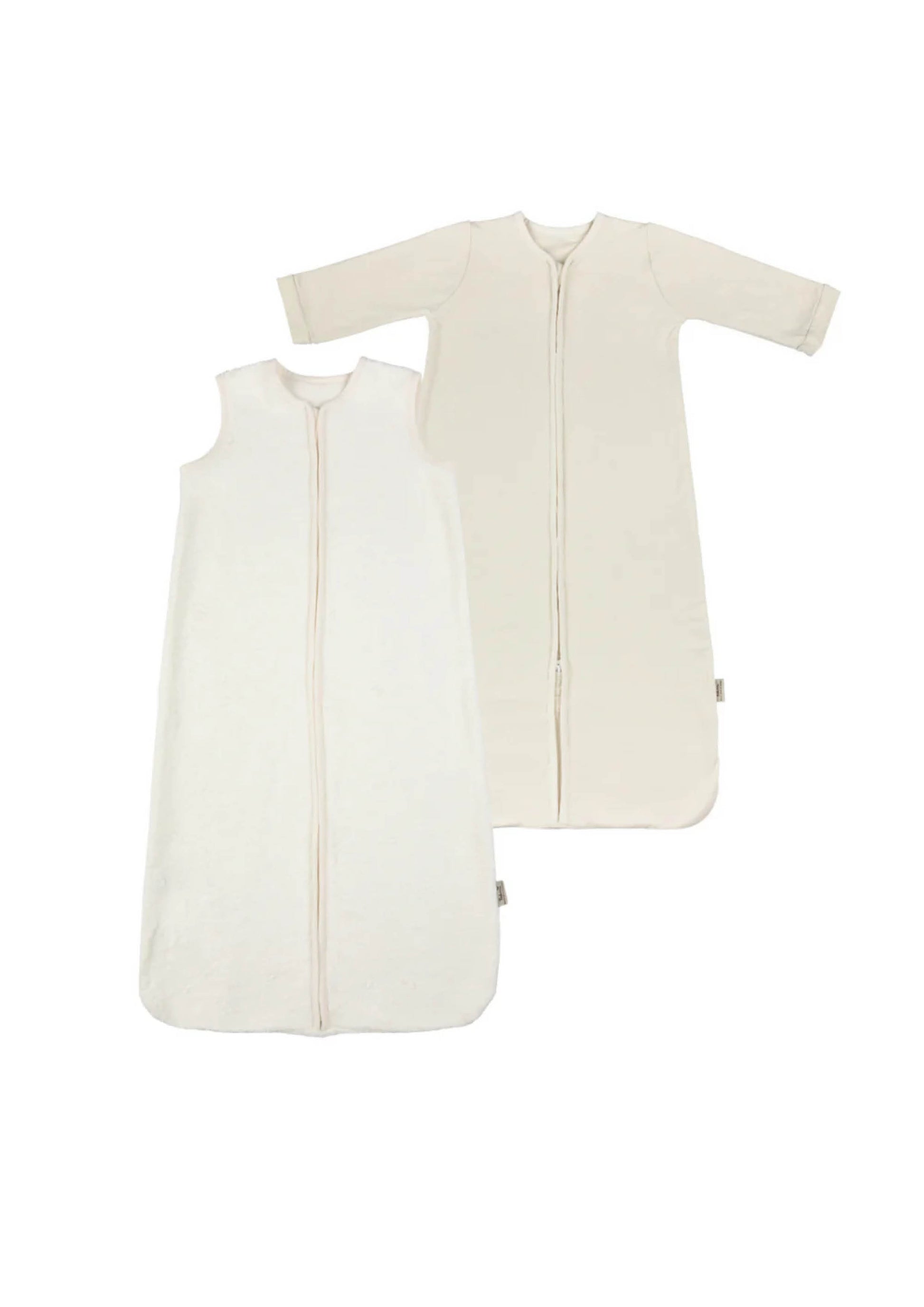 * 2-in-1 slaapzak: binnenzak met mouwen (bamboo jersey) + buitenzak zonder mouwen (bamboo badstof)