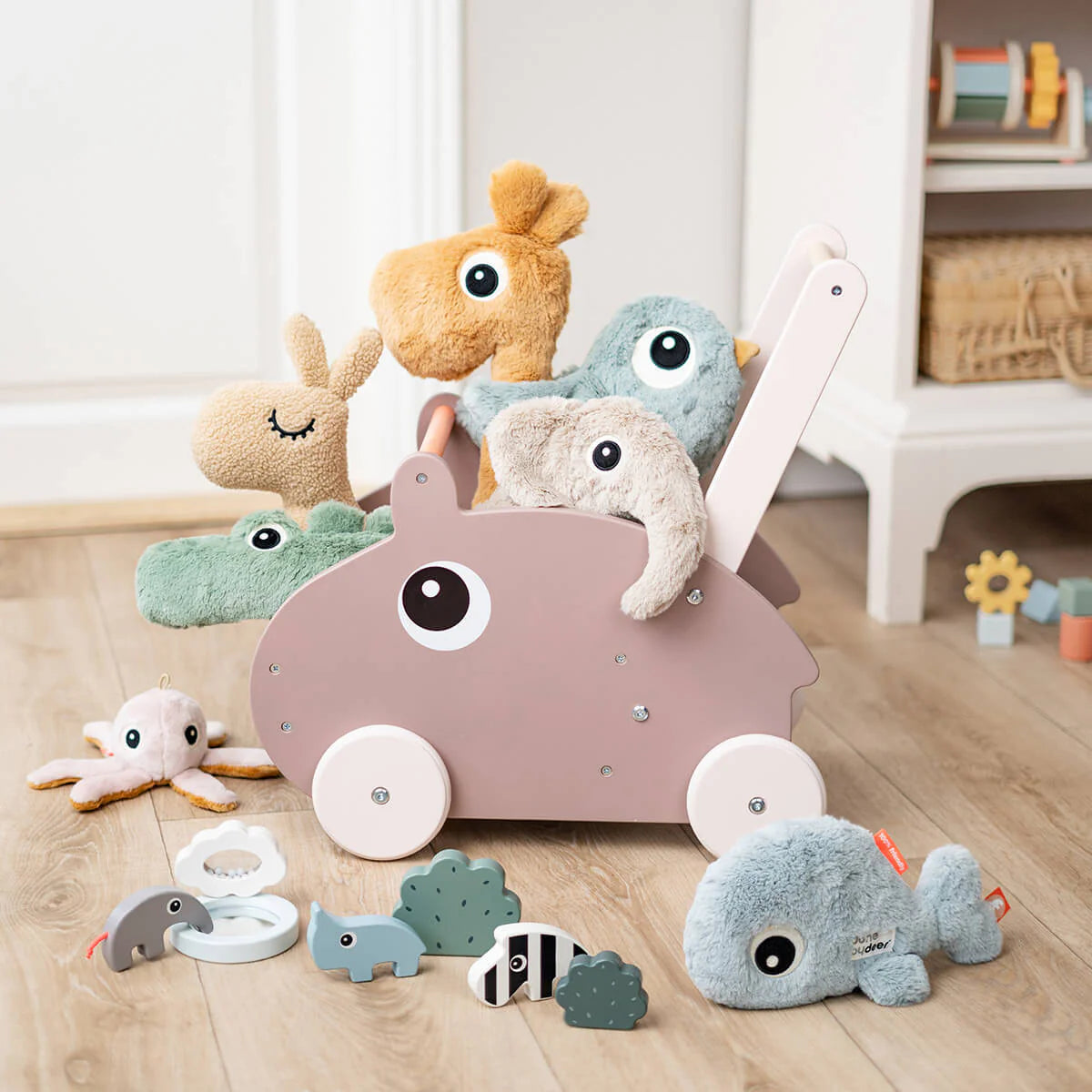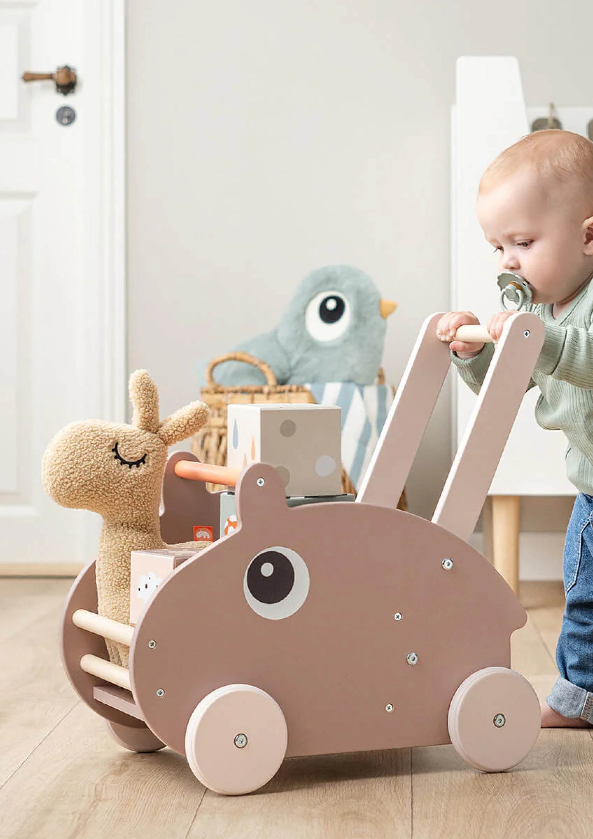 De schattige Ozzo loopwagen in poederkleur is perfect voor eerste stapjes én als poppenwagen. Stevig, veilig en leuk om mee rond te rijden.